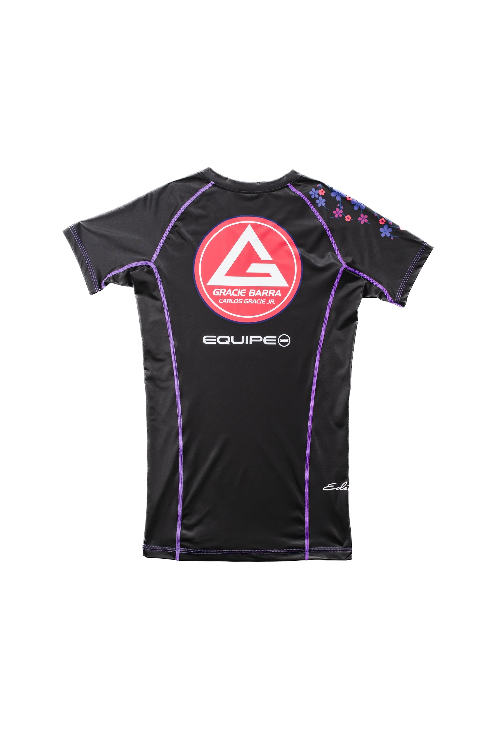 Rashguard Sakura: para treinos com e sem kimono. Detalhes de flor de sakura no ombro. Costura reforçada roxa. Tecido que absorve a umidade e não amassa. Durável com a elasticidade ideal.